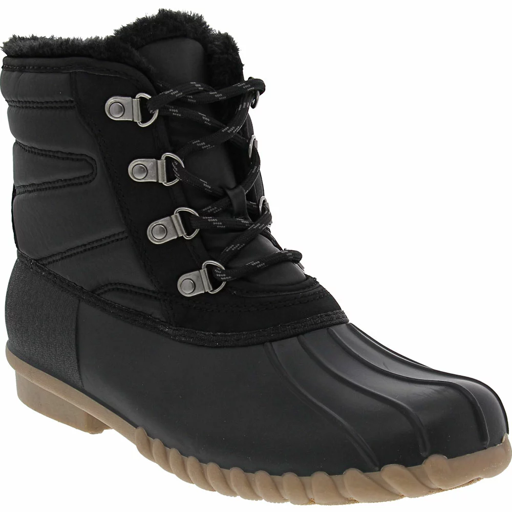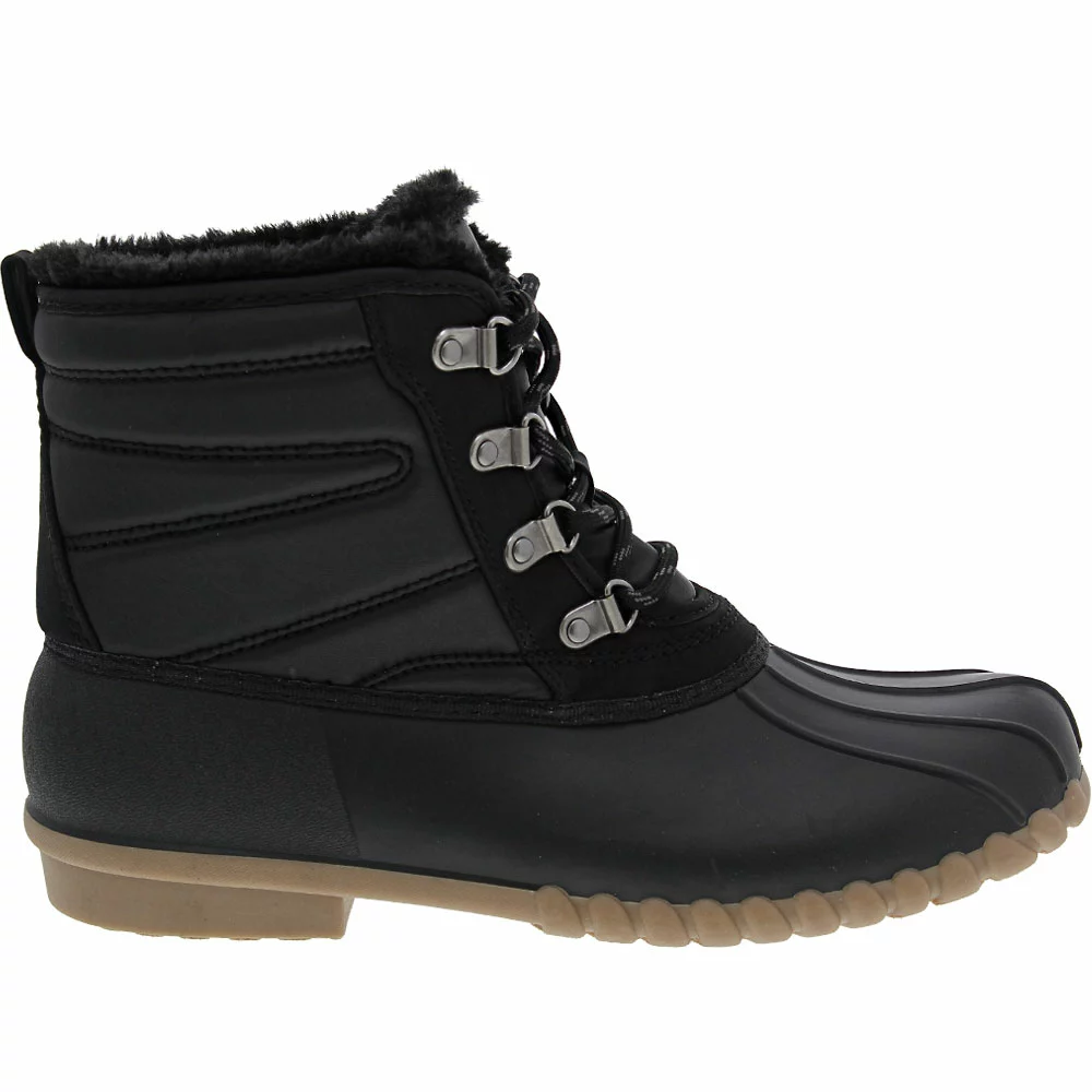 BareTraps Flynn Womens Rubber Winter Boots. Rain, snow, sleet and slush are no match for Flynn womens rubber winter boots from BareTraps. Equipped with the brand’s Stay Dry System, they feature weatherproof construction and warm insulation to ensure your feet stay both dry and warm no matter what the season delivers. With classic duck boot styling and cozy details like faux shearling that provide a look that never goes out of style and comfort meant to keep you on your feet.