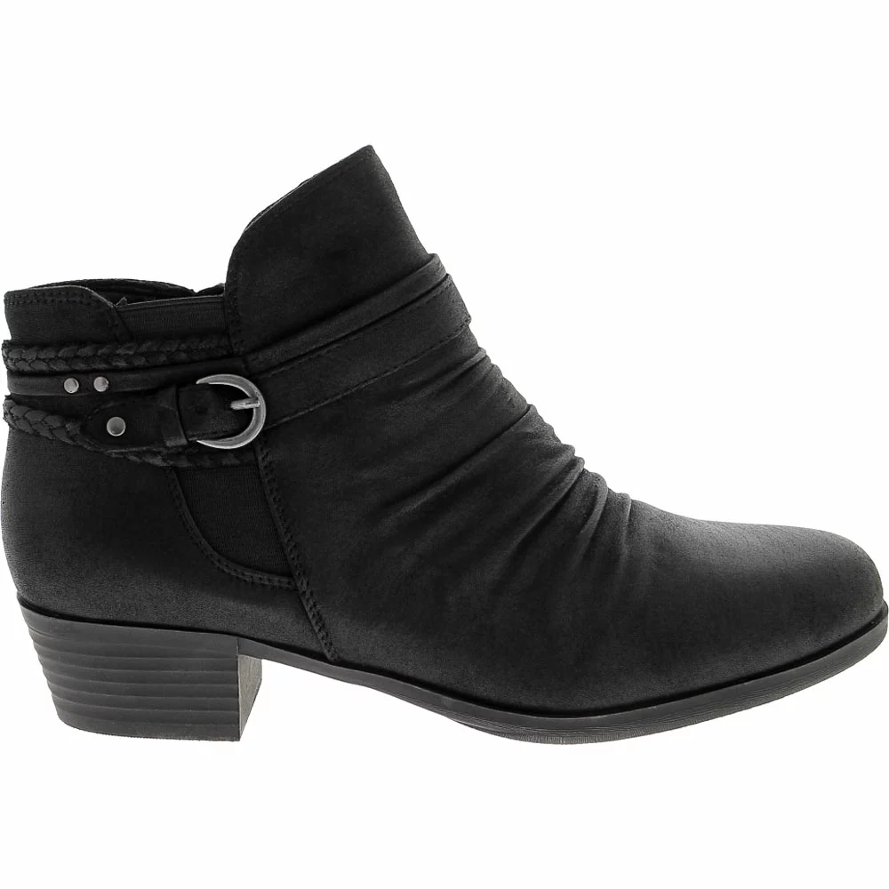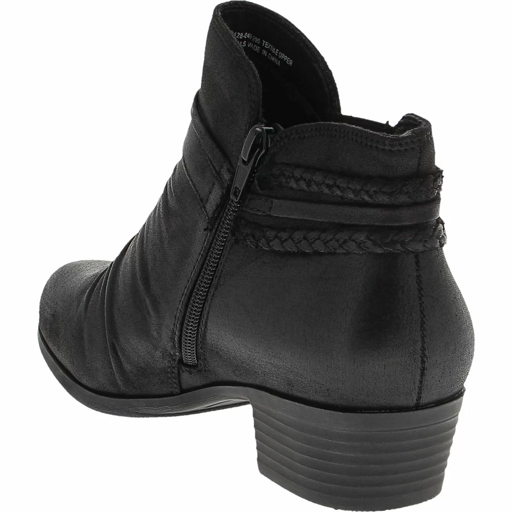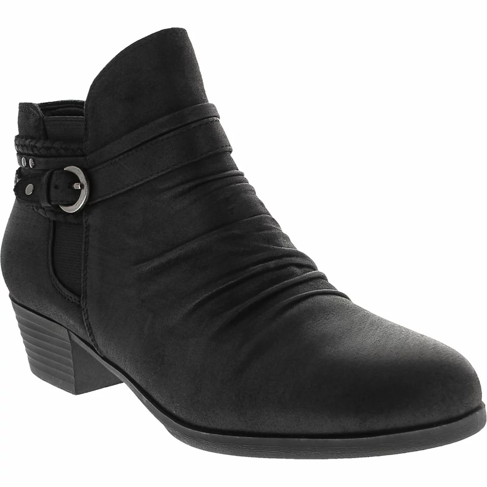 Wear.Ever. by BareTraps Nobalee Ankle Boots – Womens. BareTraps Nobalee Ankle Boots are womens ankle boots that are comfortable and stylish. With synthetic uppers, stacked heels, ruched fronts, braided accents, novelty buckles and strappy back details, these boots can be worn all day long with denim, leggings, or any other skinnies. They also feature goring details and inside zip closures. These statement boots dress up your casual wear.