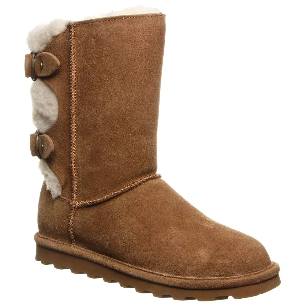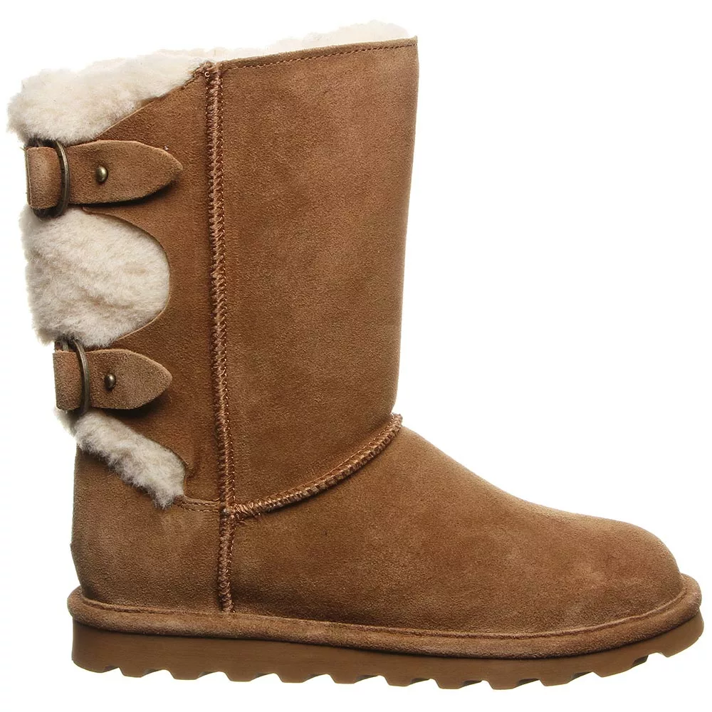 Bearpaw Eloise Comfort Winter Boots – Womens. Bearpaw’s Eloise womens winter boots offer the perfect blend of style, comfort and warmth. Luxurious cow suede uppers, rear wool or faux fur panels and double D-ring strap details give these boots’ a ruggedly elegant look. Wool blend linings and sheepskin comfort footbeds add extra warmth and cushioning. NeverWet technology repels water and stains, keeping these boots beautiful and your feet dry.