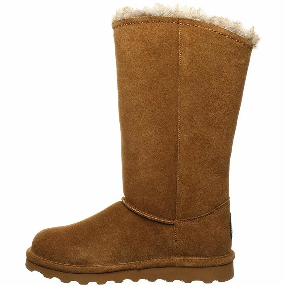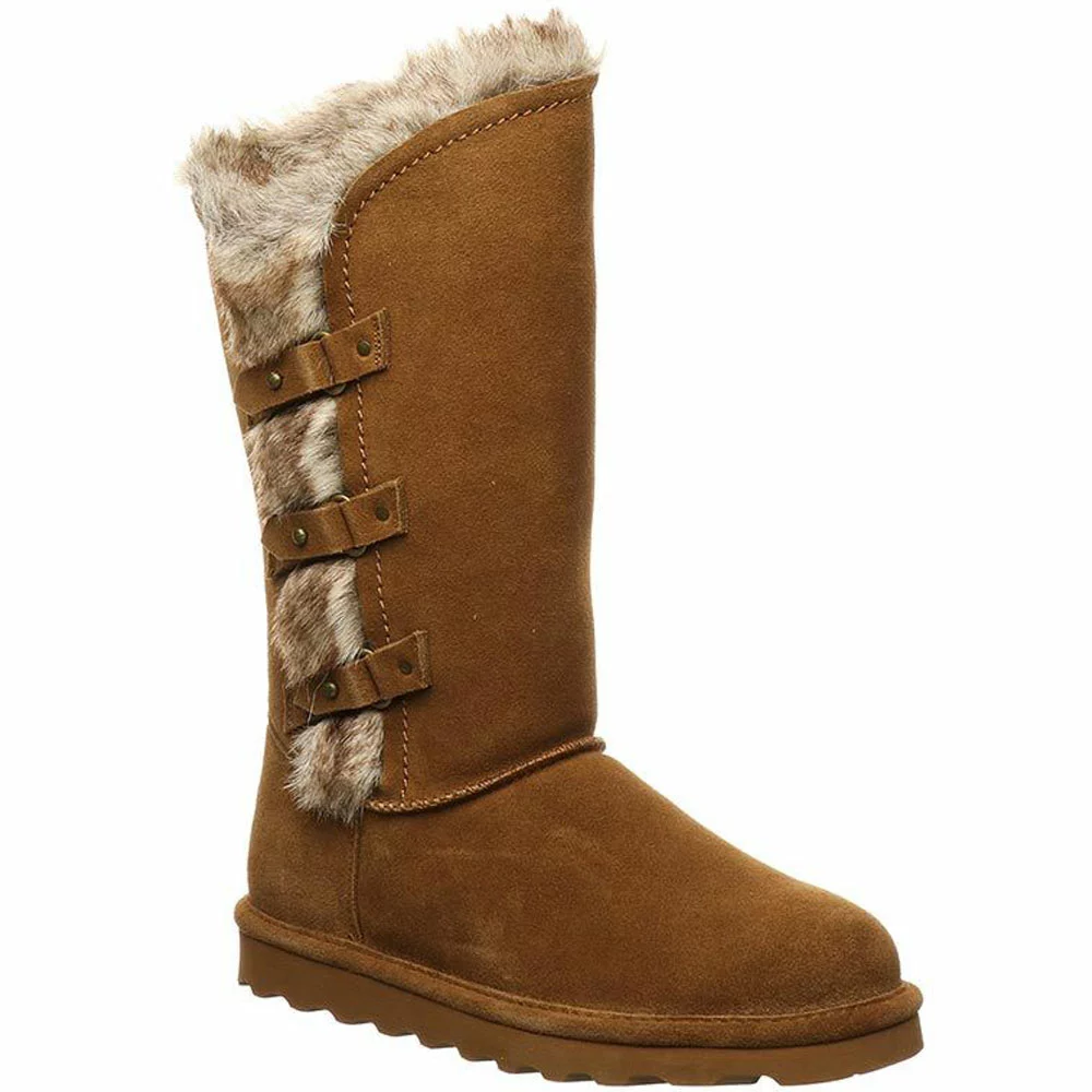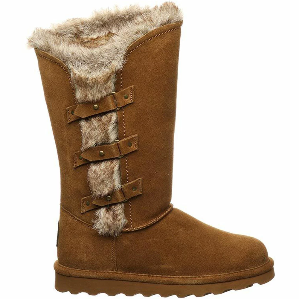Bearpaw Emery Comfort Winter Boots – Womens. Style and cold weather go together when wearing these womens winter boots. Designed to complement your unique wardrobe while also keeping feet warm and cozy, they are the perfect match for the stylish modern woman. The suede upper is treated to be resistant to water and stains and features decorative strap detailing on the sides. Faux fur takes center stage as it makes an appearance on the cuff, up the sides and on the interior for extra warmth.