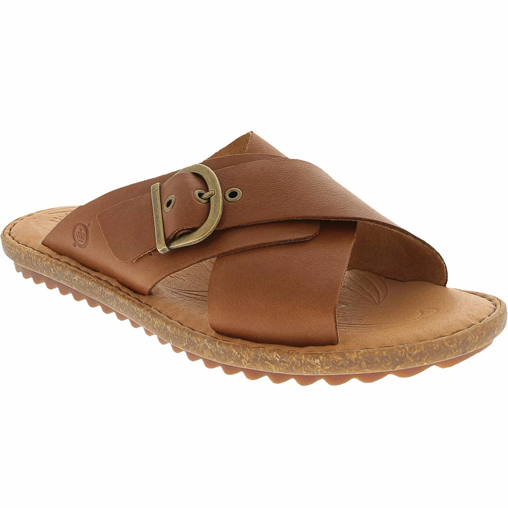 The traditional slide gets a luxurious upgrade with these attractive womens sandals. Wide, crisscrossed straps of suede or hand-finished leather give these sandals a luxurious look and feel. A cork-infused insole offers lightweight support while extra cushioning on the footbed cradles your feet. The color-matched rubber outsole has a saw-toothed design for superb traction. The adjustable metallic buckle lets you customize the fit for maximum comfort and flexibility.