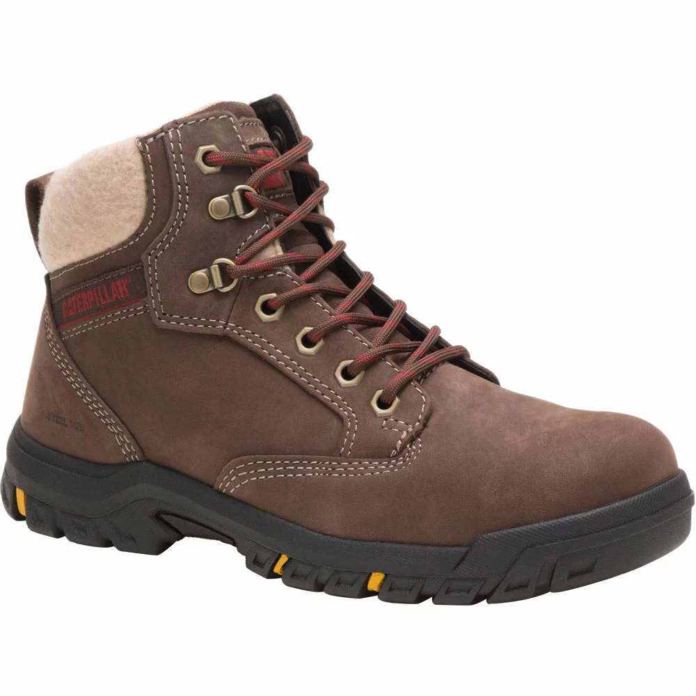 Caterpillar Footwear Tess St Safety Toe Work Boots – Womens. Stay comfortable even throughout long work hours with the Tess Steel Toe Work Boot from Caterpillar Footwear. These womens safety toe work boots are made with a durable leather upper and strobel construction that keeps your movements flexible. The slip-resistant rubber outsole provides traction that keeps you steady in any environment. A faux fur fleece textile provides warmth in cooler weather. A nylon shank and ERGO technology provide added stability and support.