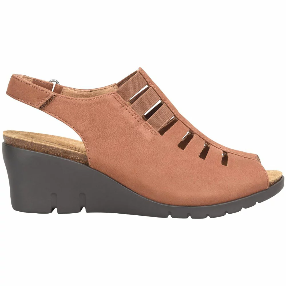 Welcome warm weather and show off your style in these womens casual shoes. Featuring peep toes and classy straps, they have a modern and trendy flair. The soft leather upper has an elastic gore for flexibility and an adjustable heel strap to get a personalized fit. These wedges have a memory foam footbed that is lined with breathable suede and a durable synthetic outsole that keeps up with your busy day and night.