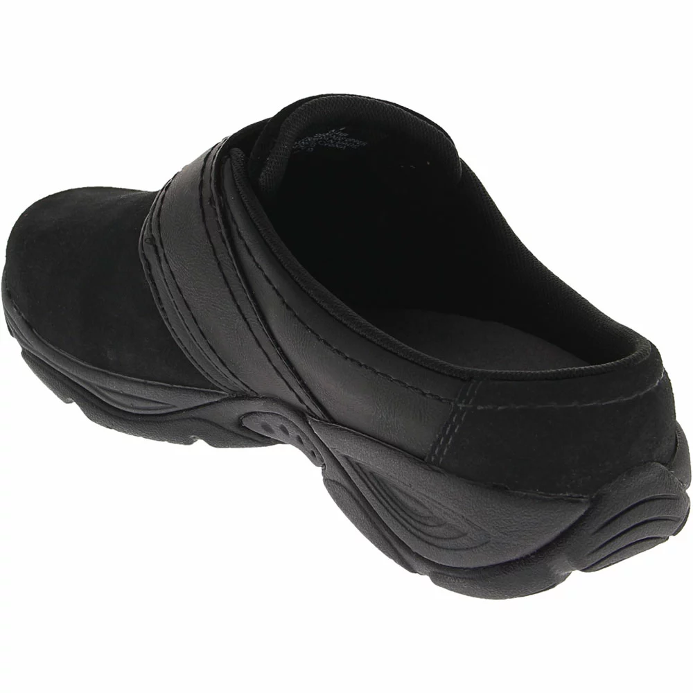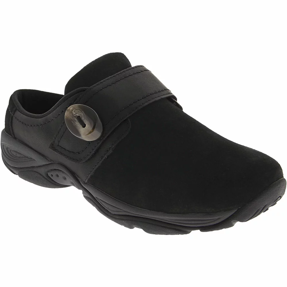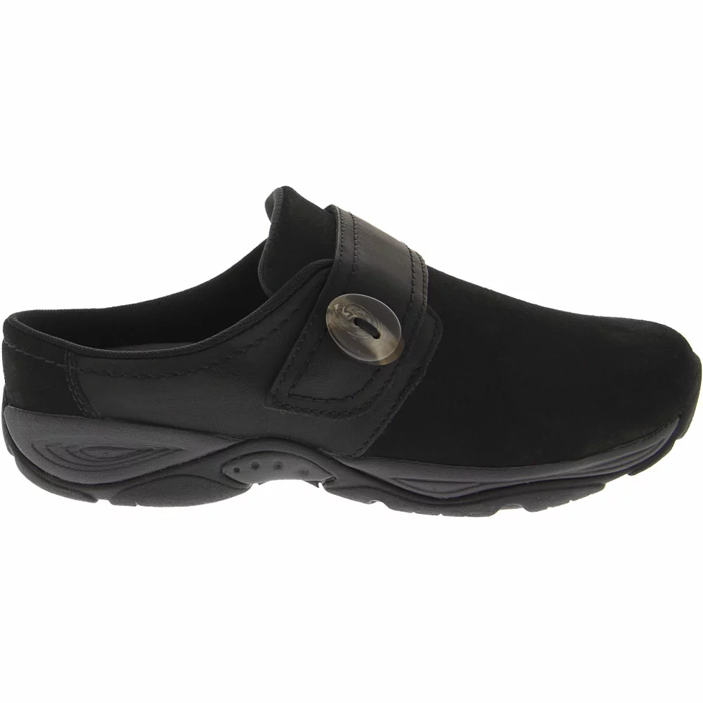 Easy Spirit Equip Clogs Slip on Casual Shoes – Womens. Your feet can experience all day comfort in these womens slip on casual shoes by Easy Spirit. This adorable clog-style slip on has a nearly-open back for easy on and off. The upper features a suede leather vamp. A wide, smooth leather strap in a contrasting color is embellished with topstitching and a large oval button and comfortably crosses the instep. The side quarter panel is also smooth leather. This shoe has a flat heel and a slip-resistant man-made outsole.