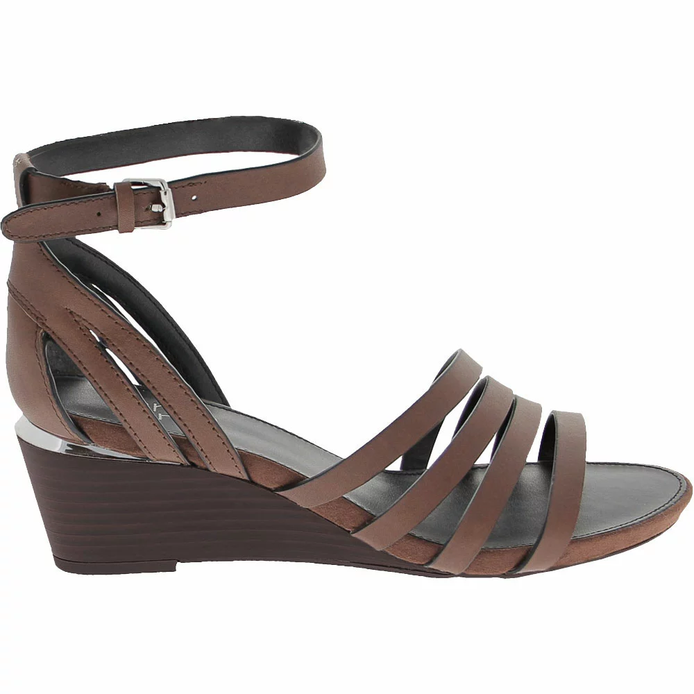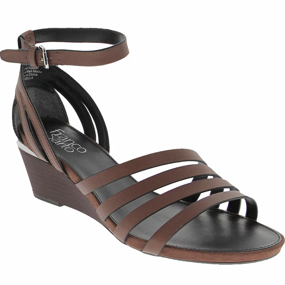 Franco Sarto Della Women’s Sandals. These chic, strappy wedge heels offer a classy look that can be dressed up or down, making them appropriate for almost any occasion and ideal for day-to-night wear. Four slim leather straps cover the vamp diagonally. Another strap circles the ankle, while an adjustable buckle closure allows a secure fit. The footbed is lightly padded for comfort, and the 2 ¼-inch stacked wedge heel is the perfect height for all-day wear.