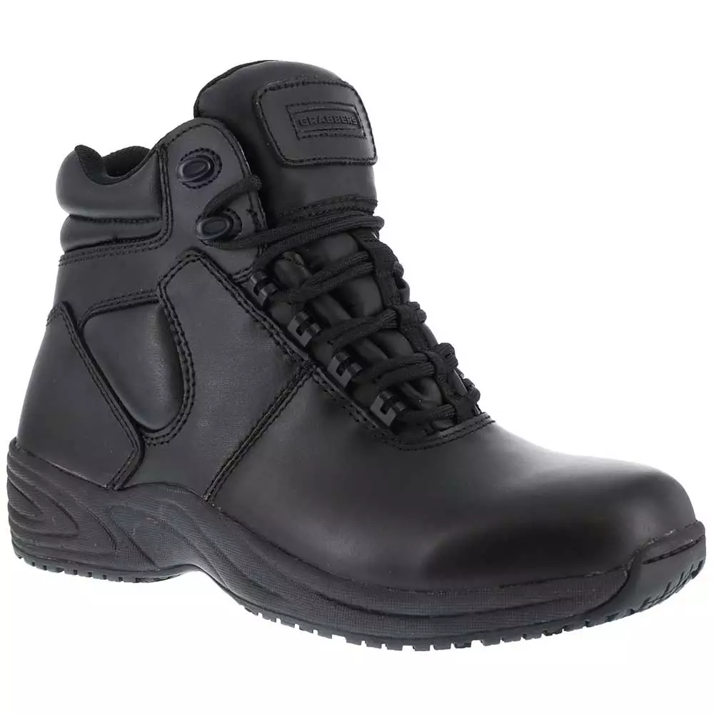 Grabbers G124 Fastener Women’s Work Shoes. Grabbers G124 Fastener features a genuine leather upper with nylon mesh lining. An EVA cushioned insert with a sponge rubber heel wedge provides great comfort for those long work days. The outsole is slip resistant with Sure Grip rubber. Security friendly and 100% non-metallic.