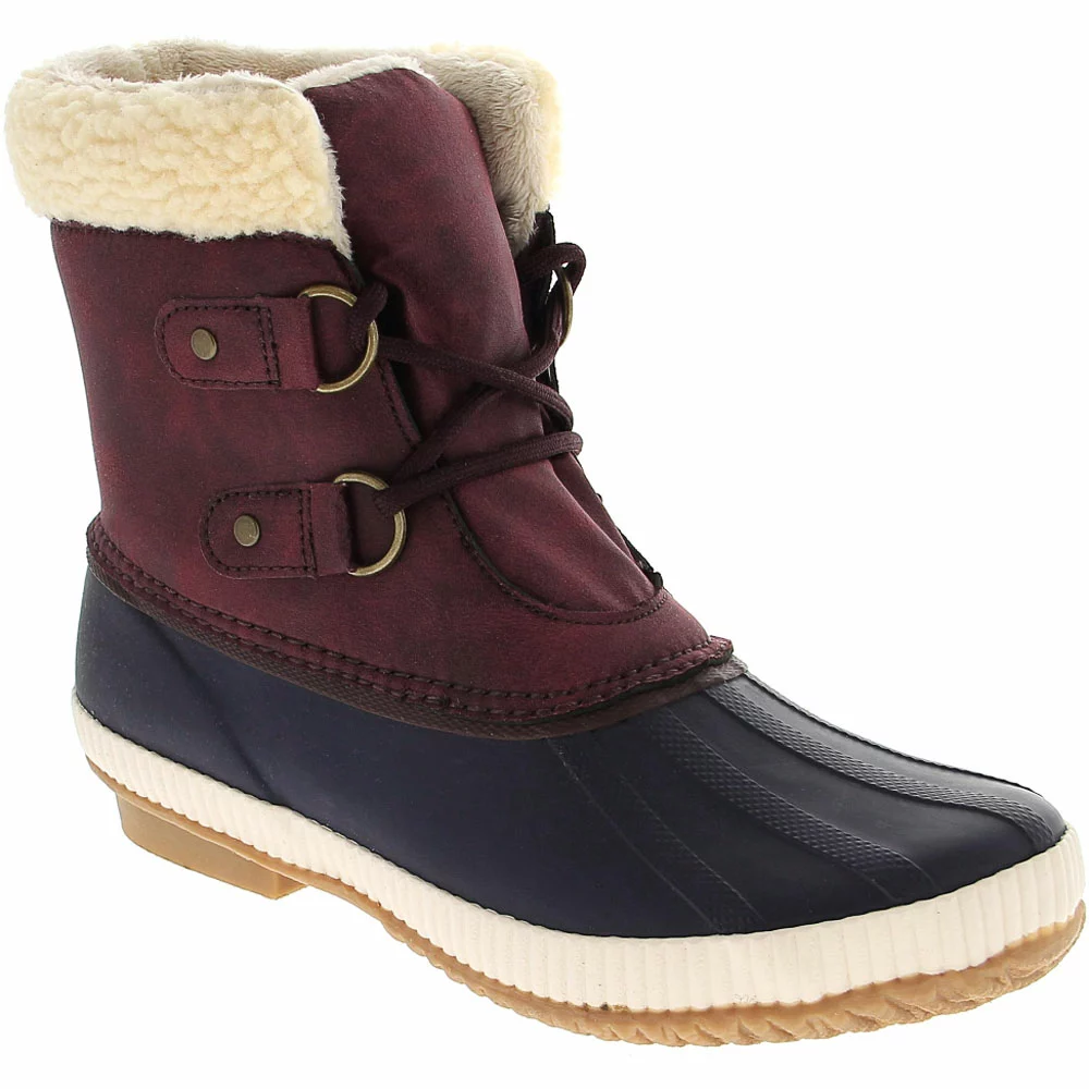 JBU Cleveland Comfort Winter Boots – Womens. The classic waterproof duck boot gets an added layer of coziness with these womens winter boots. The upper is crafted of sealed layers of rubber and vegan leather, keeping them stylish while blocking out moisture. A trendy faux fur lining keeps feet warm and toasty while a removable, contoured EVA footbed gives you comfortable support. The rubber outsole offers superb grip in snow and on wet surfaces.