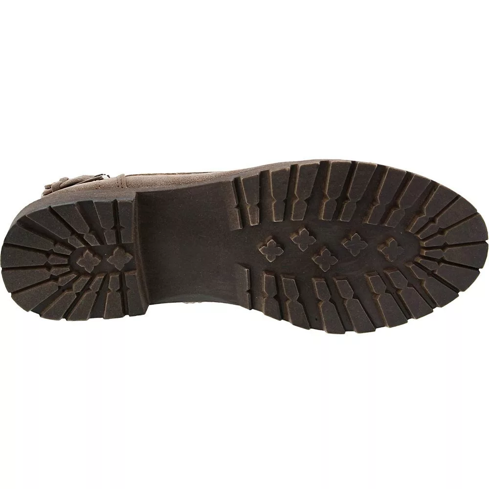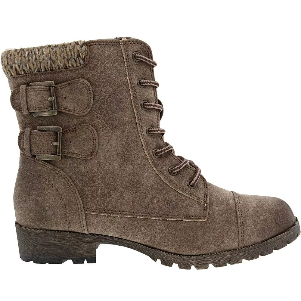 Jellypop Apollo Ankle Boots – Womens. Turn heads with the edgy look of these womens ankle boots. Combat boot style gets feminine accents with the soft knit cuff and buckled strap accents. The rugged TPR outsole provides superior traction while the cushioned latex foam insole keeps you comfortable on your feet. Zip closure with laces gives you a secure fit. These versatile boots pair well with a range of fall and winter fashions and look great with jeans, skirts and casual dresses.