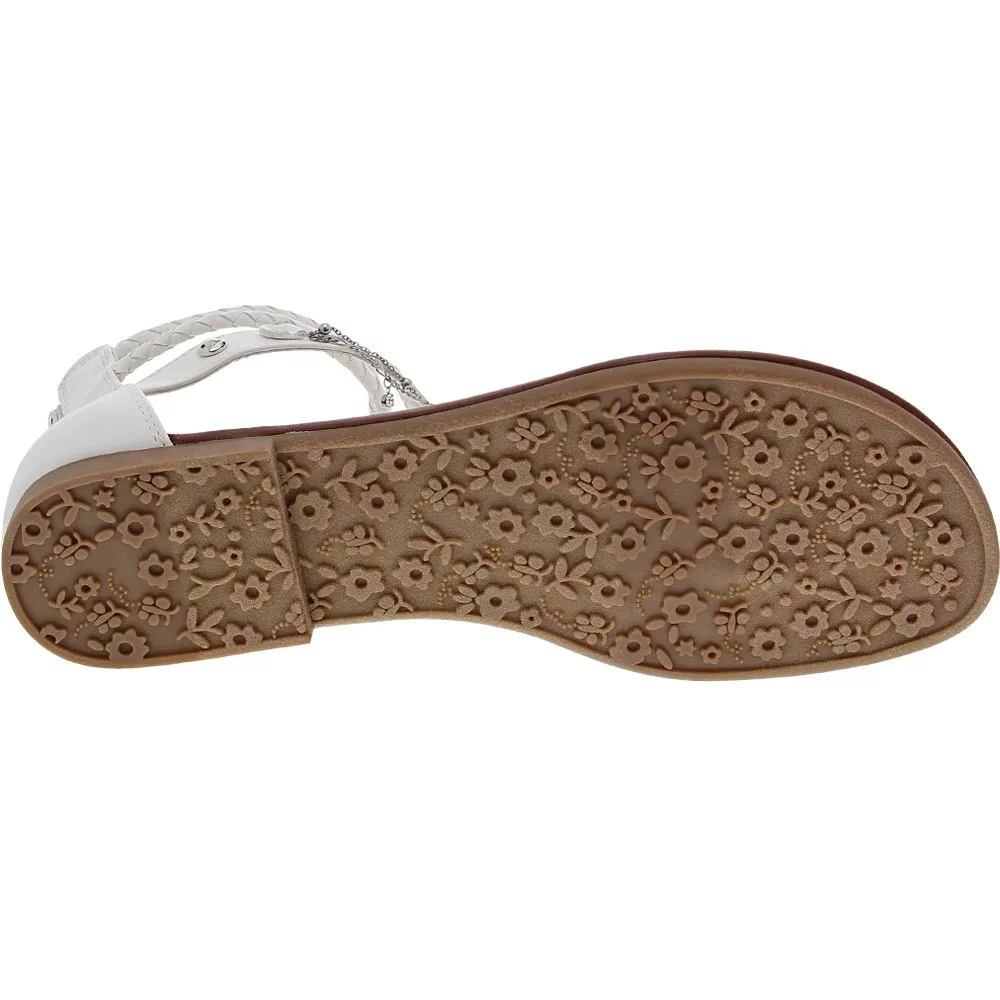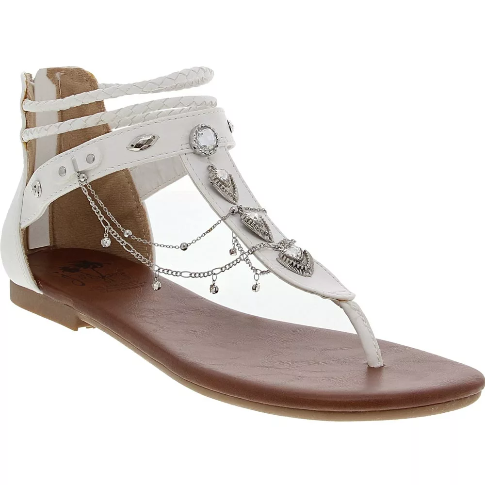 Jellypop Elvie Sandals – Womens. Take a walk on the wild side with Jellypop Elvie womens sandals. Flirty and fun, you can go places with Elvie. The strappy upper is absolutely festooned with charming details, such as chains and baubles, beads and medallions. The flat thong design lends an air of exoticism that will perfectly complement those long, flowing boho skirts in your closet. The cushioned insole keeps your feet comfy as you stroll through town.