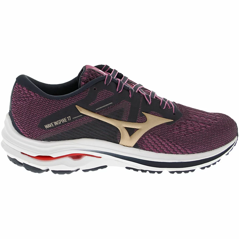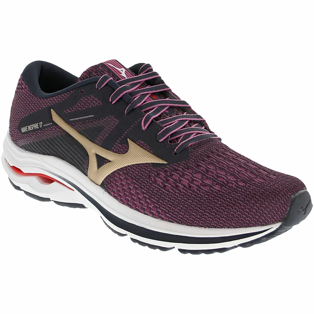 Mizuno Inspire 17 Running Shoes – Womens. Take your running game to the next level with help from Mizuno Inspire 17 womens running shoes. Designed to take seconds off your time, the foam heel wedge returns energy to your stride. The new midsole offers maximum impact protection from hard or uneven track surfaces. With a durable carbon rubber outsole, the Inspire 17 will add miles and miles to your running routine before they wear out.