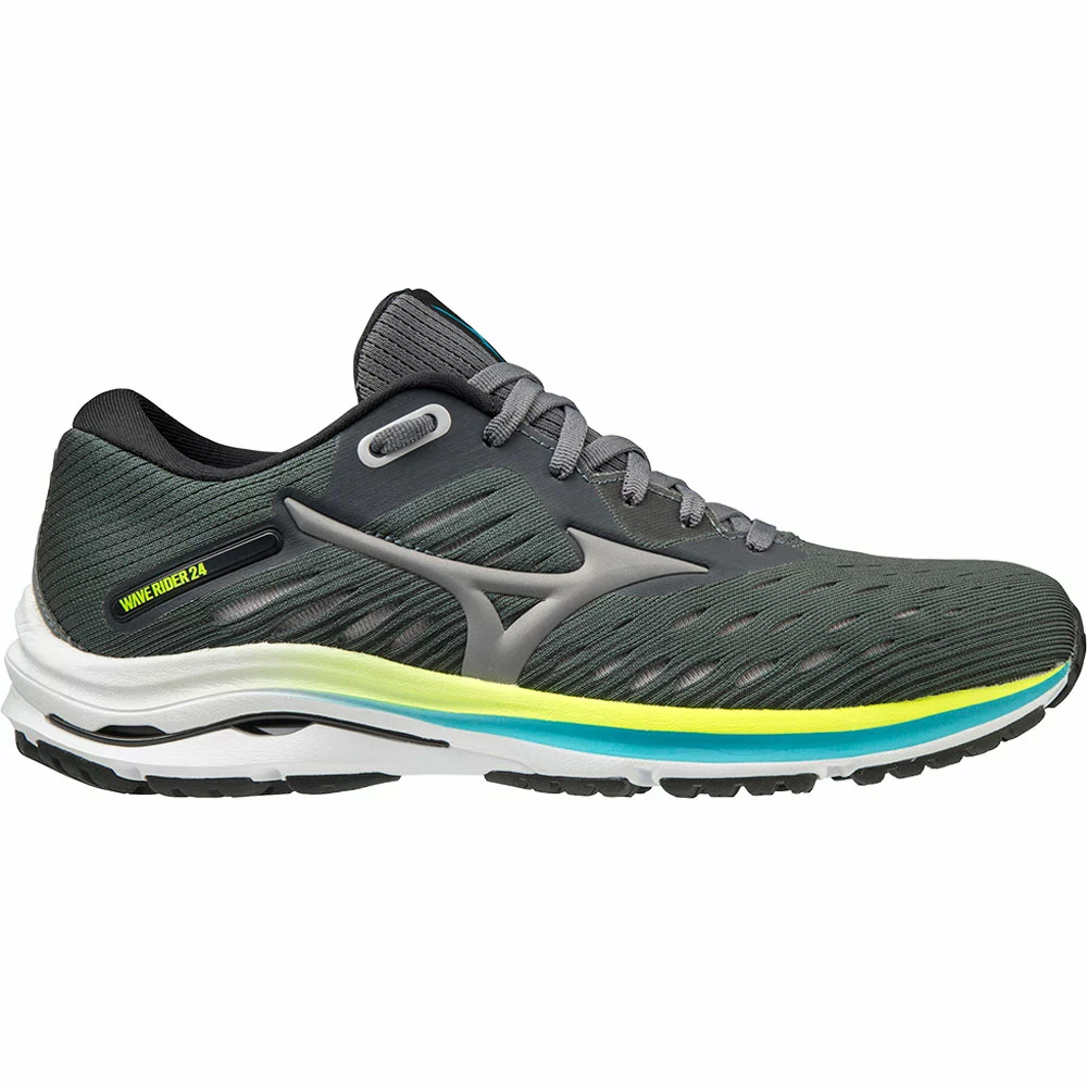 Mizuno Wave Rider 24 Womens Running Shoe. The Wave Rider 24 features all new midsole material – MIZUNO ENERZY (FOAM), that provides 15% increase in rebound and 17% increase in softness. The upper has a new lightweight engineered mesh with a non- stitch Runbird logo that provides a nice and clean look that gets out of your way as you run. New sole construction by connecting more MIZUNO ENERZY (FOAM) in to the midfoot of the shoe for an update to the Smoothride technology.