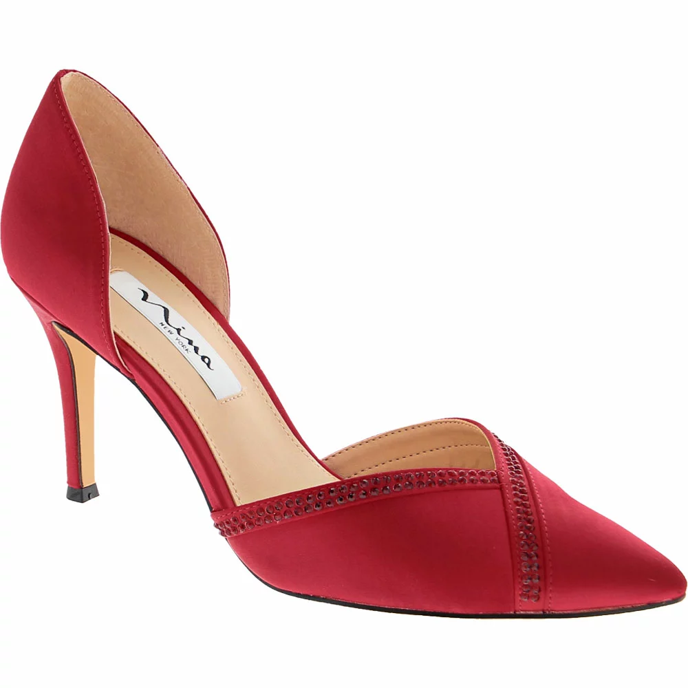 Nina Diora Prom Dress Shoes – Womens. Nina’s Diora pump lends an upscale touch to any outfit. This slip-on shoe offers sleek and simple elegance with its pointed closed toe and wrapped stiletto heel. Sparkling multifaceted hot-fix rhinestone embellishments form a crisscross pattern on the toe cap. Its classic d’Orsay silhouette flatters a wide range of ensembles including career, casual and evening wear. Manmade lining and a lightly padded footbed make the Diora a great everyday choice.
