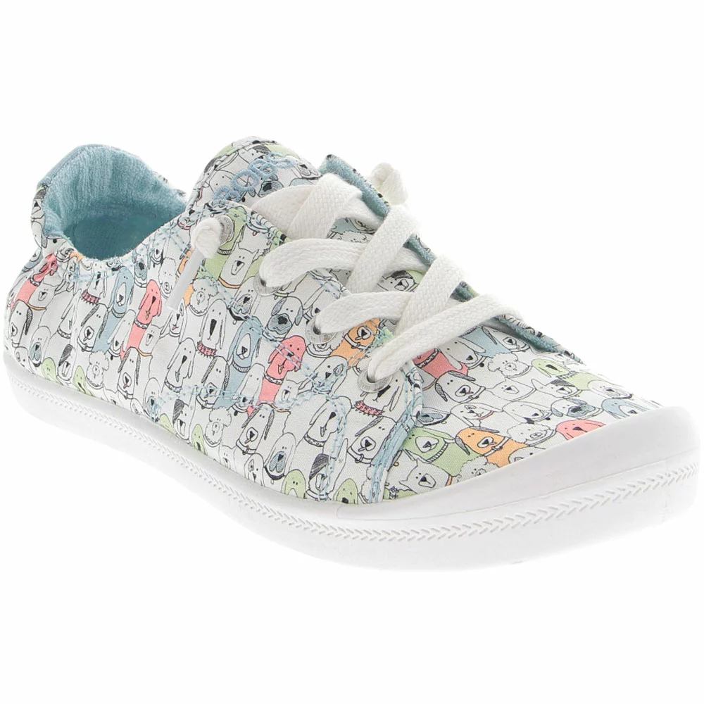 Skechers Beach Bingo Wag Party Womens Life Style Shoe. Get doggy cuteness with the BOBS Beach Bingo – Camp Wag shoe. This casual slip-on sneaker features a soft canvas upper with an allover ‘Wag Party’ print and a cushioned Memory Foam comfort insole.