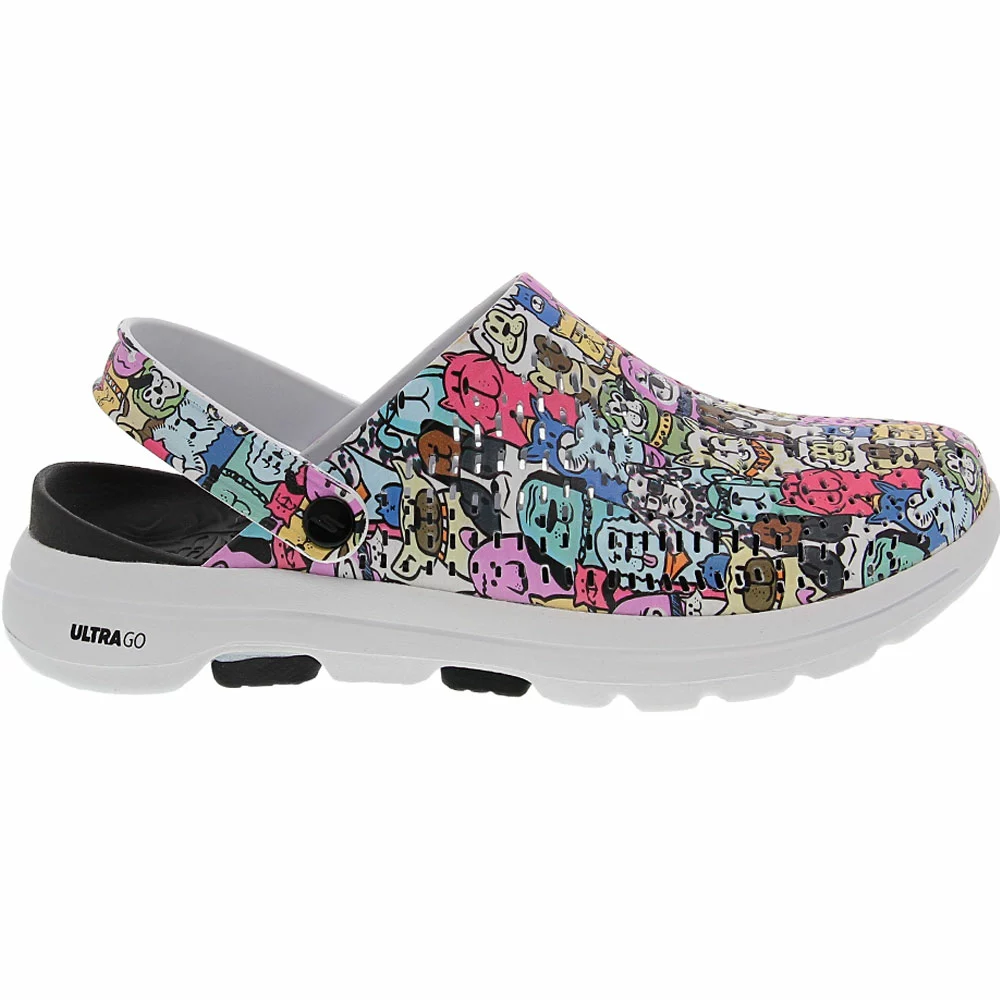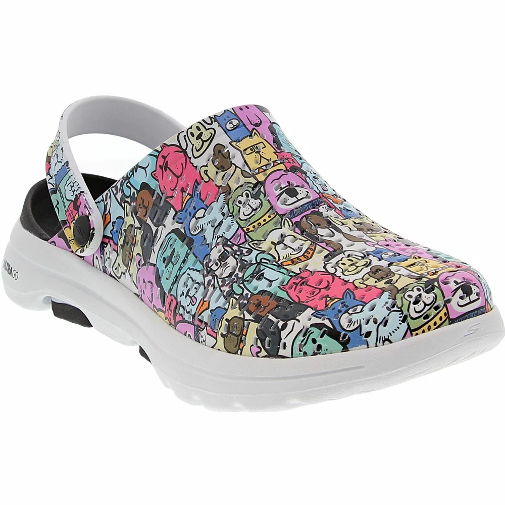 Skechers Go Walk 5 Dog Lover Clog – Womens. Calling all puppy lovers! The Skechers GOwalk 5™ Dog Lover womens clogs exhibit fun style and guaranteed comfort with its lightweight design and colorful cartoon dog print. Featuring both ULTRA GO™ cushioning and COMFORT PILLAR TECHNOLOGY™, you enjoy all-day comfort. Crafted as a one-piece Cali Gear® slip-on clog, easily slide on these shoes for your next trip to the dog park.
