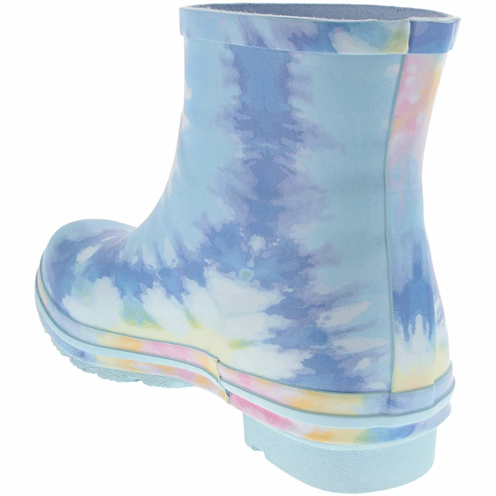 Splash around all you want while exuding a fun, colorful style in this pair of waterproof womens rain boots. Featuring a refreshing tie-dyed print that makes them stand out from the crowd. Whether doing outdoor chores or running errands on a rainy day, they are made with a soft, flexible rubber that moves with your every step. They have a breathable, moisture-wicking lining that makes them suitable for all-day wear and a durable, grippy outsole.