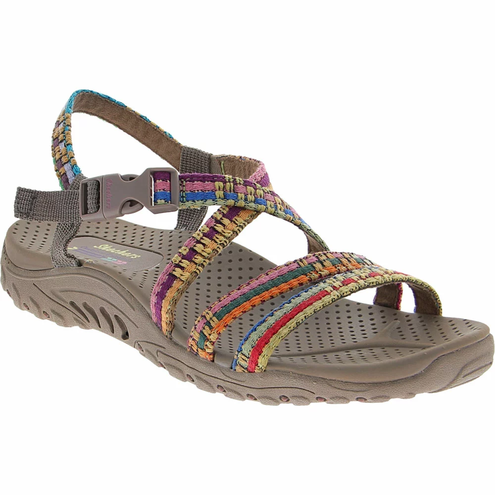 Skechers Reggae Sew Me Sandals – Womens. Colorful comfort could be yours with Skechers’ Reggae Sew Me womens sandals. They feature fun multicolored uppers with ankle straps and durable outsoles for all-day wear. The cushioned footbeds are designed to help you walk extra miles in comfort during your busy day.