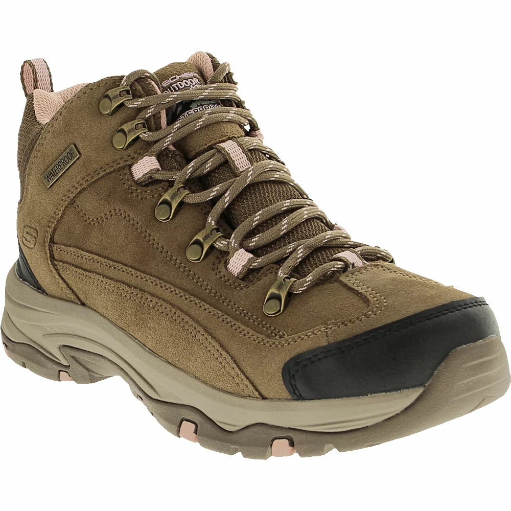 Skechers Trego Alpine Trail Waterproof Hiking Shoes – Womens. Hit the trails with confidence and style in these womens hiking shoes. They have a trendy silhouette while still meeting your outdoor adventure needs. These lace-up low tops feature a waterproof suede upper with mesh for breathability, ensuring feet stay dry and comfortable. A memory foam insole cushions each step, helping you focus on the experience. No matter what terrain the path has in store for you, the durable, high-grip outsole is designed for optimal traction.