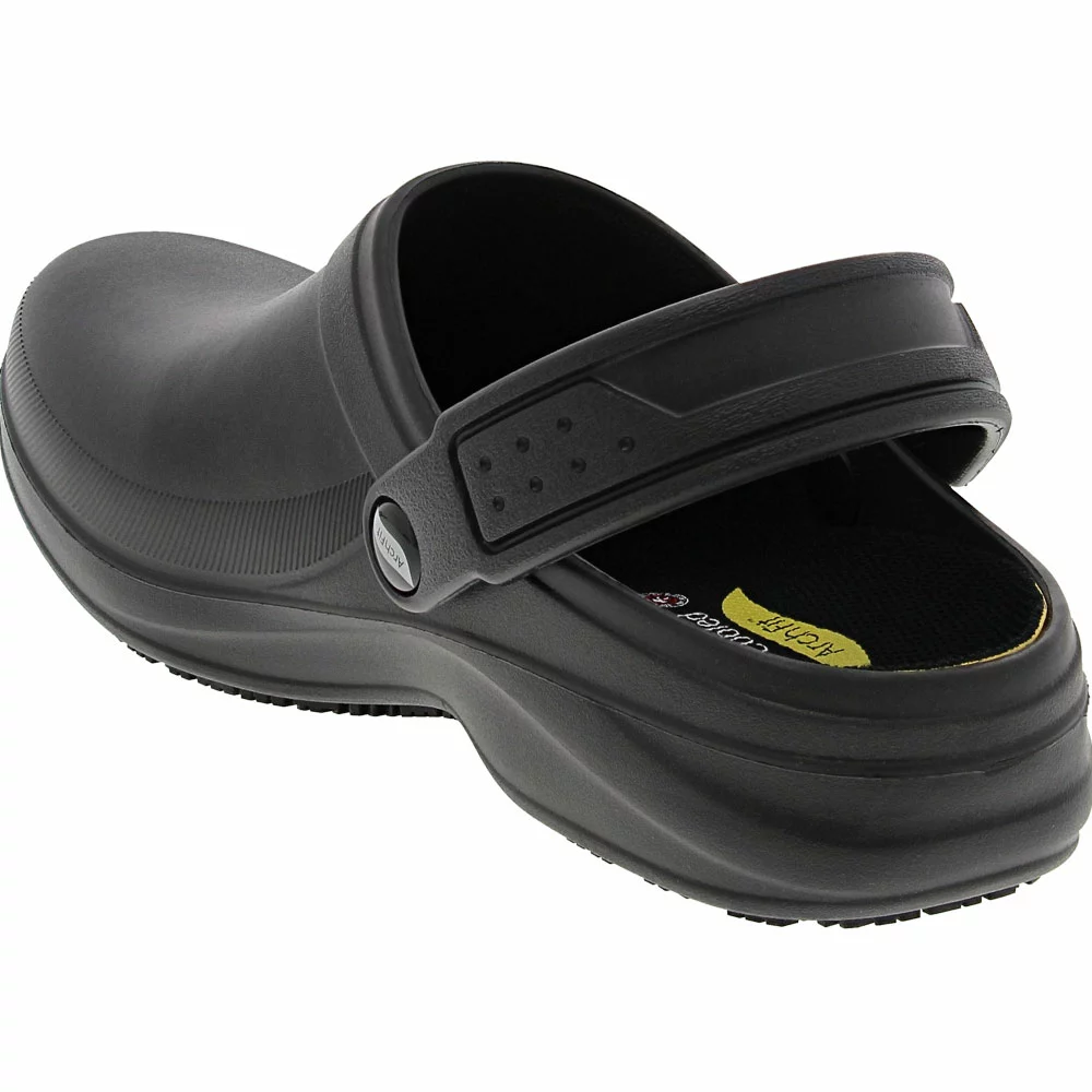 Slip on this comfortable pair of Skechers Work womens soft toe work shoes that feature a clog-style with a movable back strap. Excellent arch support stabilizes your feet to provide you with the ultimate in all-day comfort, while the outsole guards against injuries from slipping on wet surfaces. The textile lining feels soft against your skin and prevents a buildup of blisters.