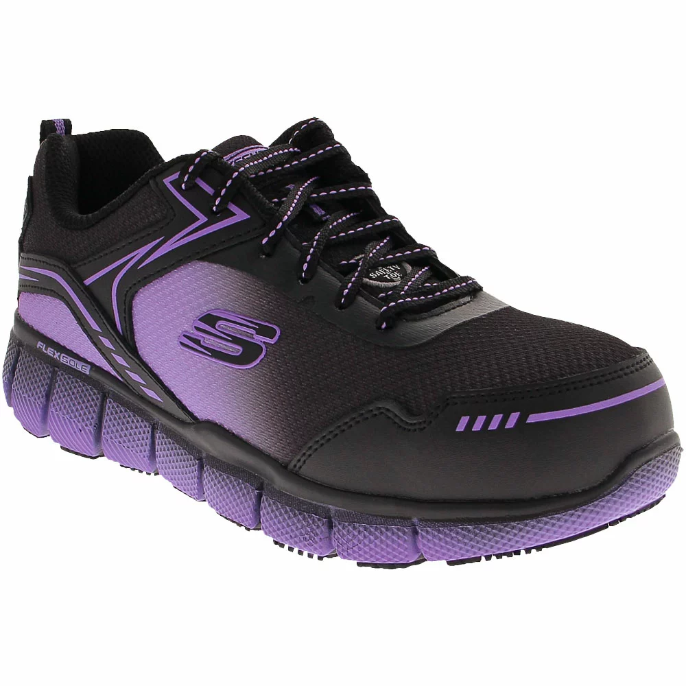 Skechers Work Arterios Safety Toe Work Shoes – Womens. Skechers Work’s Telfin – Arterios womens safety toe work shoes dazzle with their vivid black and ombre color, accent color laces and contrast side logo detailing. Beneath those smooth action leather uppers, the Telfin Arterios work sneaker incorporates lightweight aluminum alloy safety toes, puncture-resistant insoles and slip-resistant flexible rubber traction outsoles. Full-length memory foam insoles and lightweight FlexSole midsoles provide cushioned shock-absorbing comfort all day long.