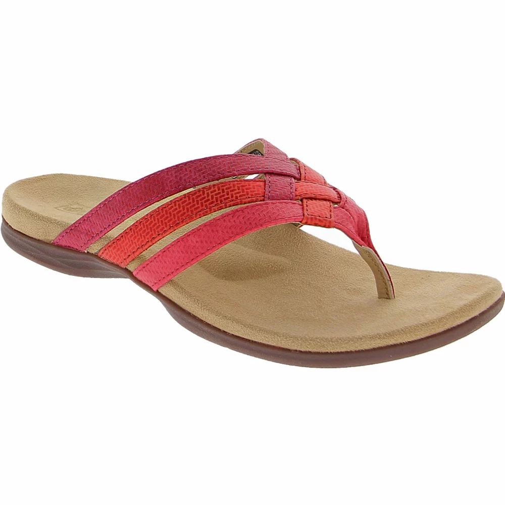 Spenco Triple Strap Women’s Flip Flops. These thong-style sandals aren’t your run-of-the-mill beach flip flops; you can wear them to nearly any warm-weather event. Three interwoven straps made of synthetic material in coordinating colors exhibit a polished, sophisticated twist while remaining ultra-comfortable. The insole is contoured to conform to the shape of your foot and boasts a deep heel cup, fantastic arch support, and a metatarsal dome. The soft microfiber lining has an antimicrobial agent to prevent bacteria and odors.