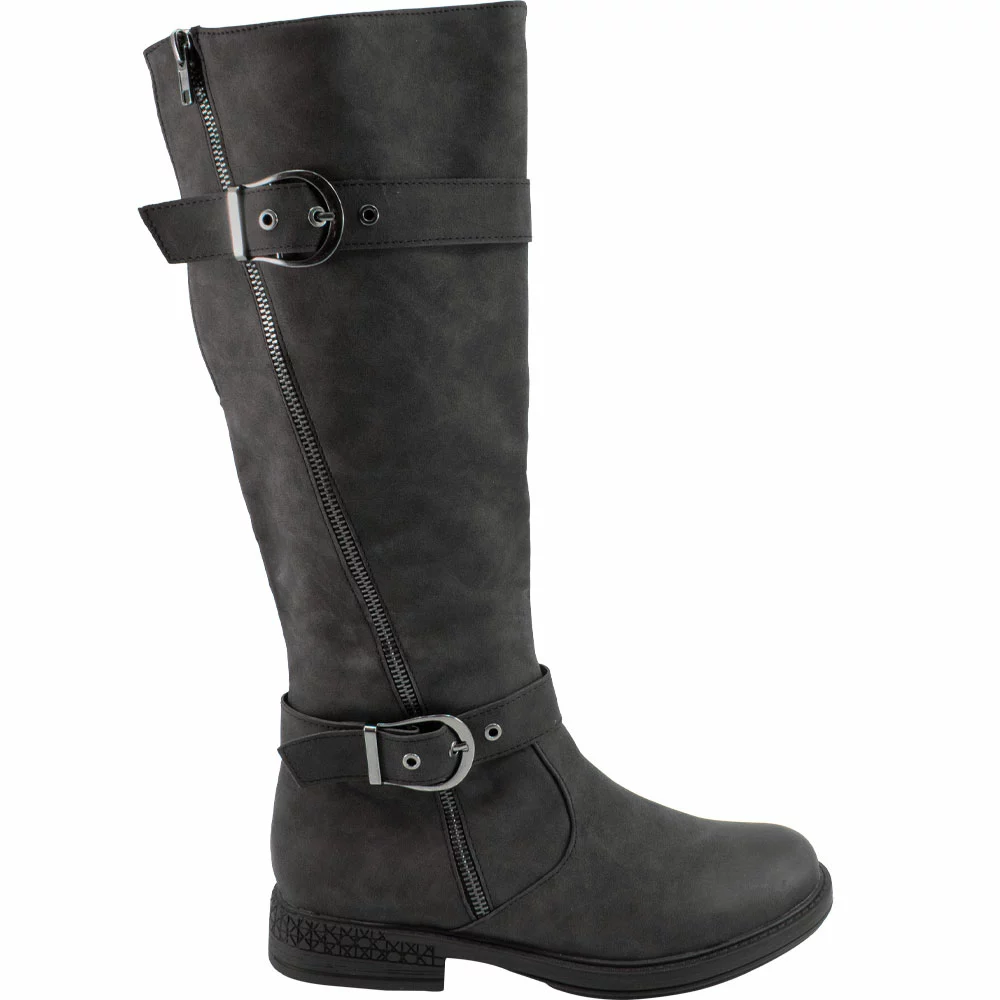 Two Lips Too Jordy Tall Dress Boots – Womens. Enjoy superior comfort and style with these womens tall dress boots. These trendy riding boots have PU uppers with zip closures and adjustable buckles at the calves. Soft memory foam insoles keep you comfortably supported while rubber outsoles give you stability and traction. A rounded almond-shaped toe gives these boots a versatile and feminine look that works beautifully with your favorite cool-weather outfits.