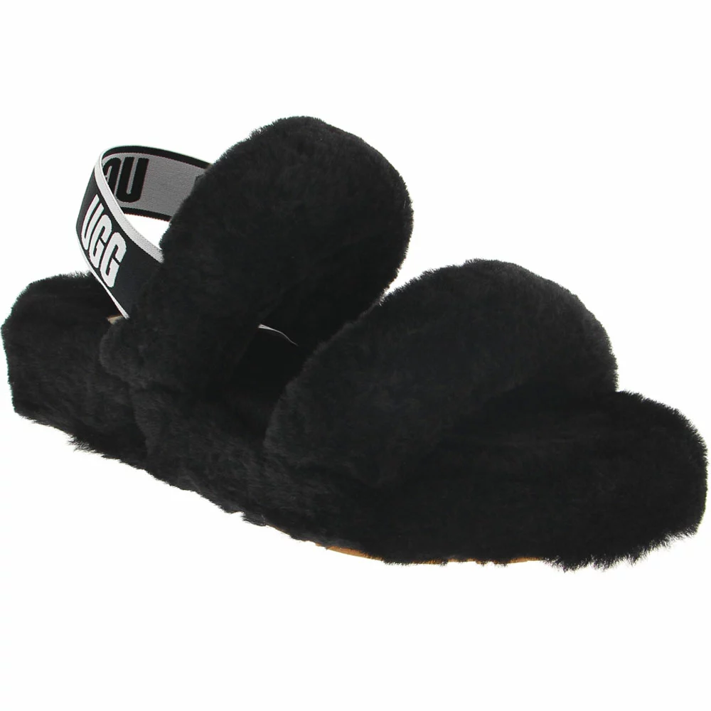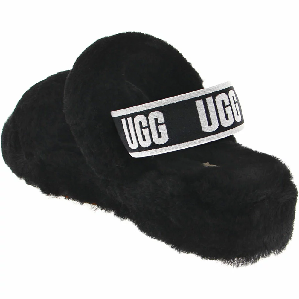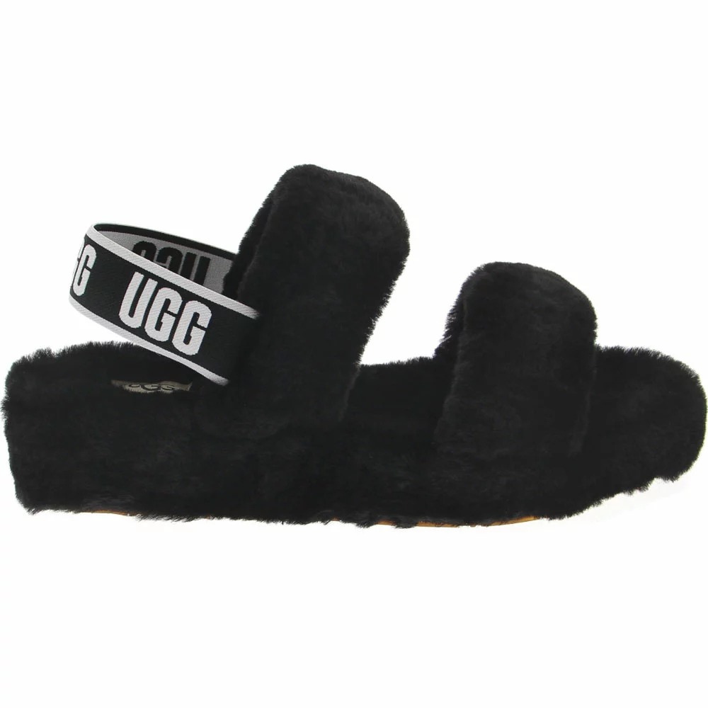 UGG Oh Yeah Slide Slippers – Womens. Add some fun flair to any outfit with these iconic womens slippers. Designed with a stylish elastic strap for warm-weather wear, the UGG Oh Yeah Slide Slippers are versatile for indoor or outdoor wear and bring a playful vibe to every ensemble. The soft sheepskin upper, lining, midsole and insole combine with a molded rubber outsole for maximum comfort and grip. The low heel provides extra support in every step.