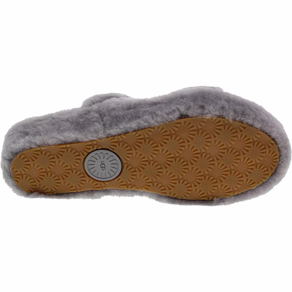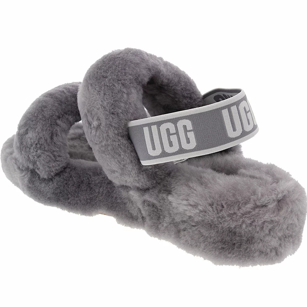 UGG Oh Yeah Slide Slippers – Womens. Add some fun flair to any outfit with these iconic womens slippers. Designed with a stylish elastic strap for warm-weather wear, the UGG Oh Yeah Slide Slippers are versatile for indoor or outdoor wear and bring a playful vibe to every ensemble. The soft sheepskin upper, lining, midsole and insole combine with a molded rubber outsole for maximum comfort and grip. The low heel provides extra support in every step.