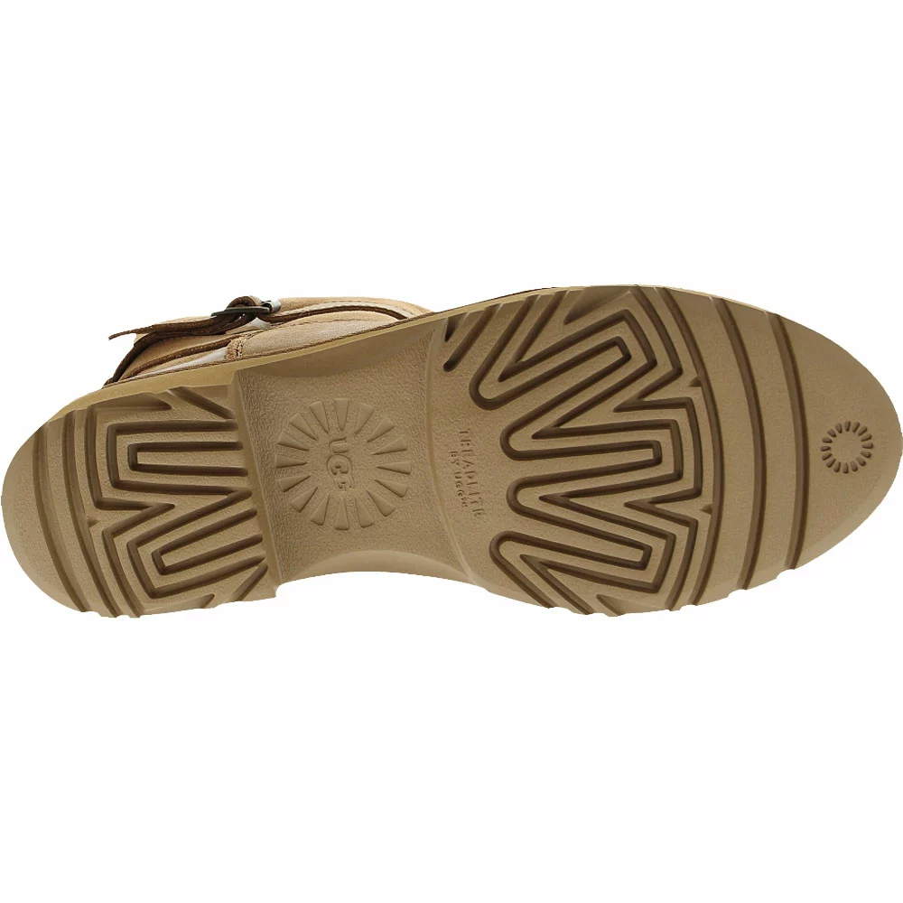UGG Romely Buckle Comfort Winter Boots – Womens. Casual style meets all-purpose comfort in UGG’s Romely Buckle womens winter boots. The Romely Buckle starts with leather and sheepskin uppers. A leather strap with metal buckle hardware encircles the boot shaft, giving it a rugged yet polished look. This style includes 10-millimeter sheepskin linings in the shaft, paired with 10-millimeter UGGplush vamp linings and insoles made of 80% wool and 20% lyocell.