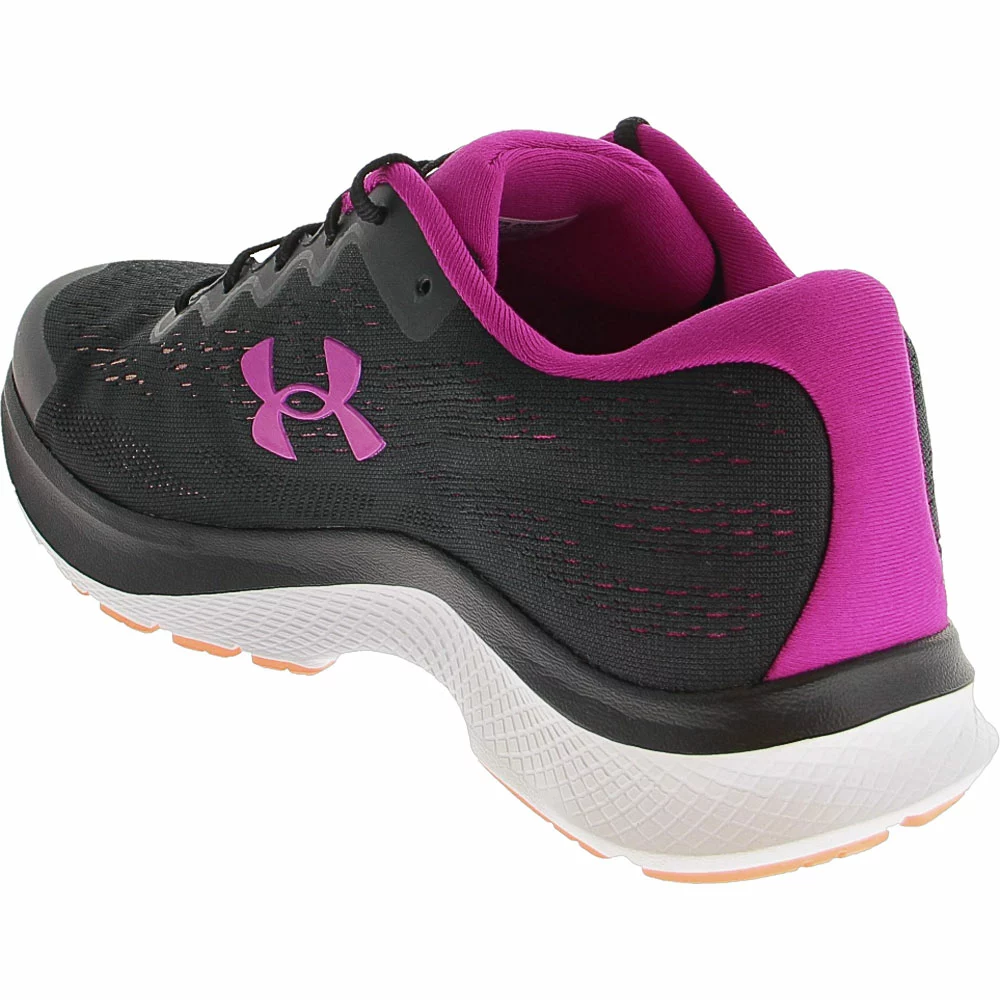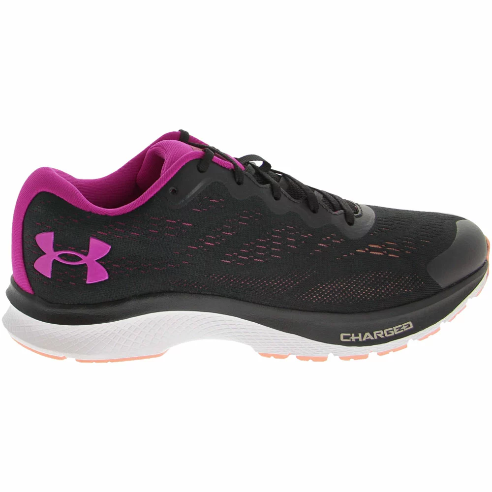 Under Armour Charged Bandit 6 Running Shoes – Womens. Let these lightweight womens running shoes support you for the long haul. The engineered mesh upper has a padded collar and tongue for a secure, cushioned fit. The midsole features a TPU shank for enhanced stability and Charged Cushioning technology for targeted softness and support. A molded full-length sockliner keeps you cushioned and comfortable while preventing slippage. The durable solid rubber outsole gives extra coverage to high-impact zones without added weight.